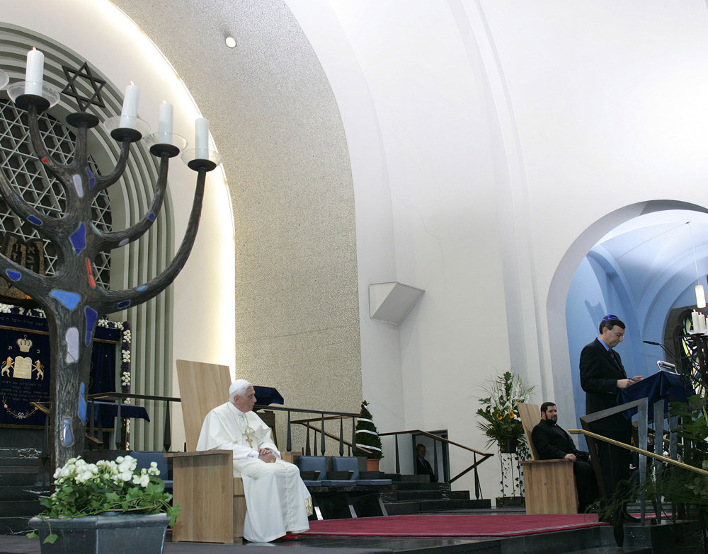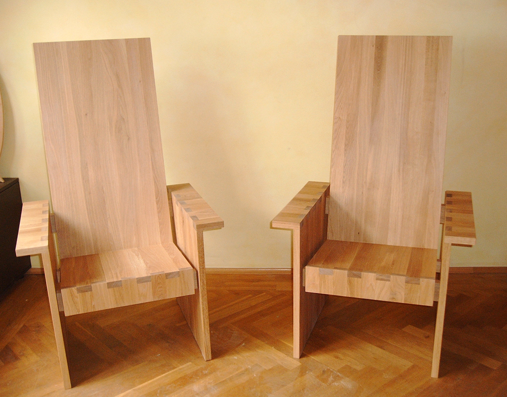 Für den Besuch von Papst Benedikt XVI. in der Synagogen-Gemeinde Köln anlässlich des Weltjugendtags 2005 wurden in unserer Schreinerei zwei baugleiche "Thron"-Stühle gefertigt. Einen Stuhl für den hohen Gast aus Rom und einen für den gastgebenden Rabbiner. Wir haben die Stühle - schlicht und modern, aber in perfekter ergonomischer Form - aus gut abgelagerter massiver Eiche hergestellt. Die Oberfläche ist geölt, mit weißem Pigmentanteil. Die Maße sind 138,5 x 82 x 71 cm (HxBxT).
