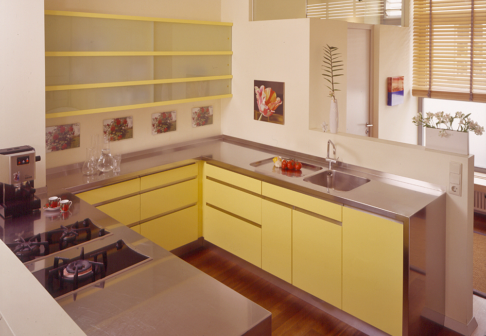Funktions-U mit Edelstahl-Arbeitsplatte und Türen aus farbig lackiertem MDF. Der Oberschrank hat Türen aus satiniertem Glas.