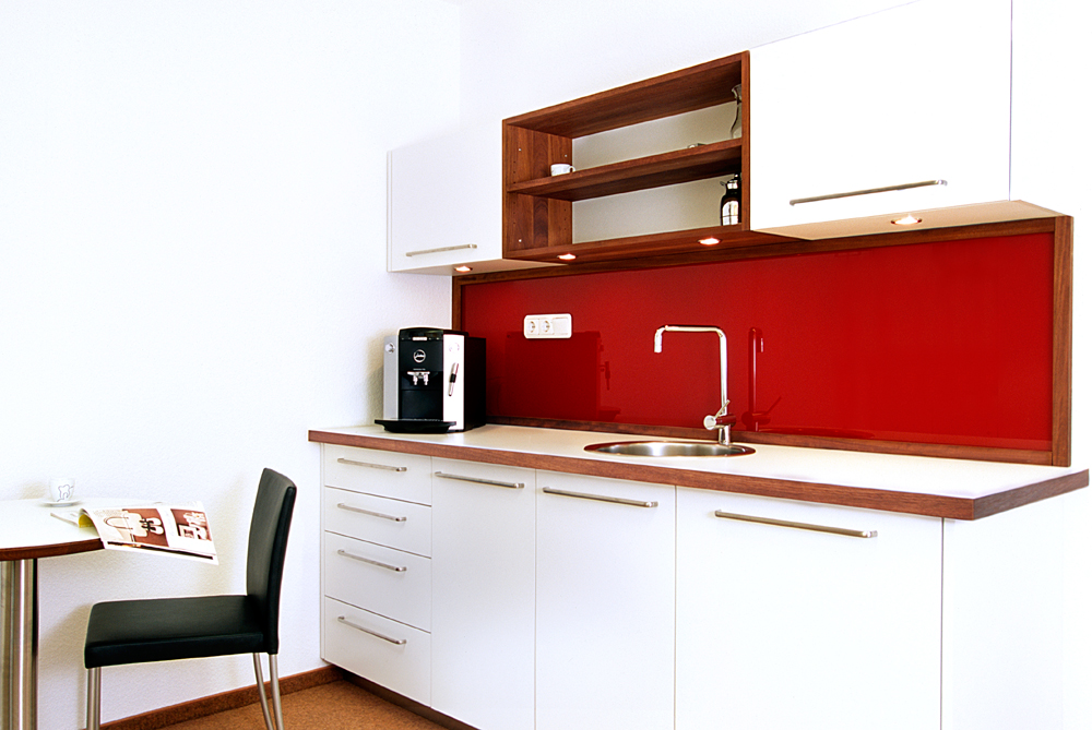 Roter Hingucker zu Fronten aus weiß lackiertem MDF. Ein schöner Kontrast, der obendrein nützlich ist, denn der rote Streifen ist ein Spritzschutz aus hinterlackiertem Glas. Die Arbeitsplatte hat massive Anleimer und ist mit Resopal beschichtet.