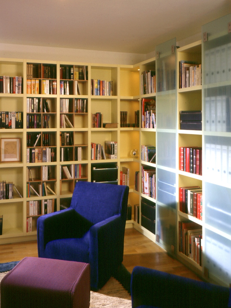 Wenn sich der Trend zum Zweit- und Drittbuch weiterhält, so brauchen Sie Platz: Wie in dieser Bibliothek aus MDF lackiert. Besonders gute Stücke verschwinden Staub- und Bücherwurm sicher hinter den satinierten Glasschiebetüren.