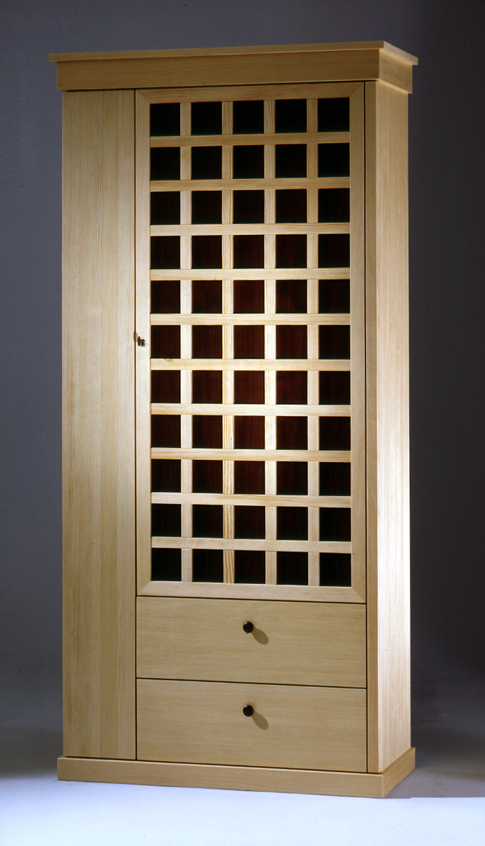 In den Schrank mit Karomuster aus Pinie und Nussbaum können Sie selbstverständlich auch gestreifte Sachen hängen.