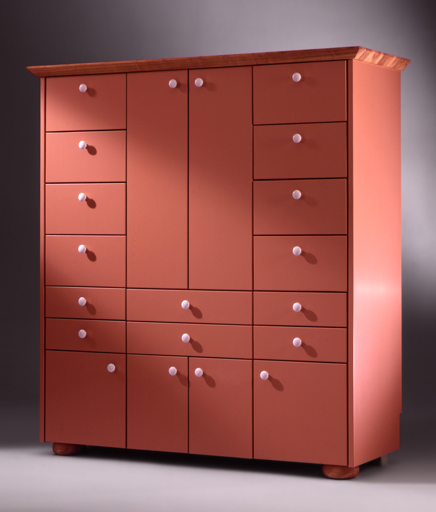 Hier ist alles geregelt: Hinter den lackierten Fronten mit Porzellangriffen verbergen sich Stereoanlage, CDs, Kassetten und vieles mehr in maßgeschneiderten Fächern. MDF und Kirsche massiv.
