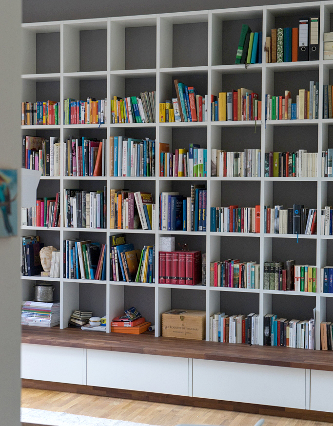 Der tiefe Schubladenunterbau bietet einigen Leuten Sitzgelegenheiten beim schmökern.